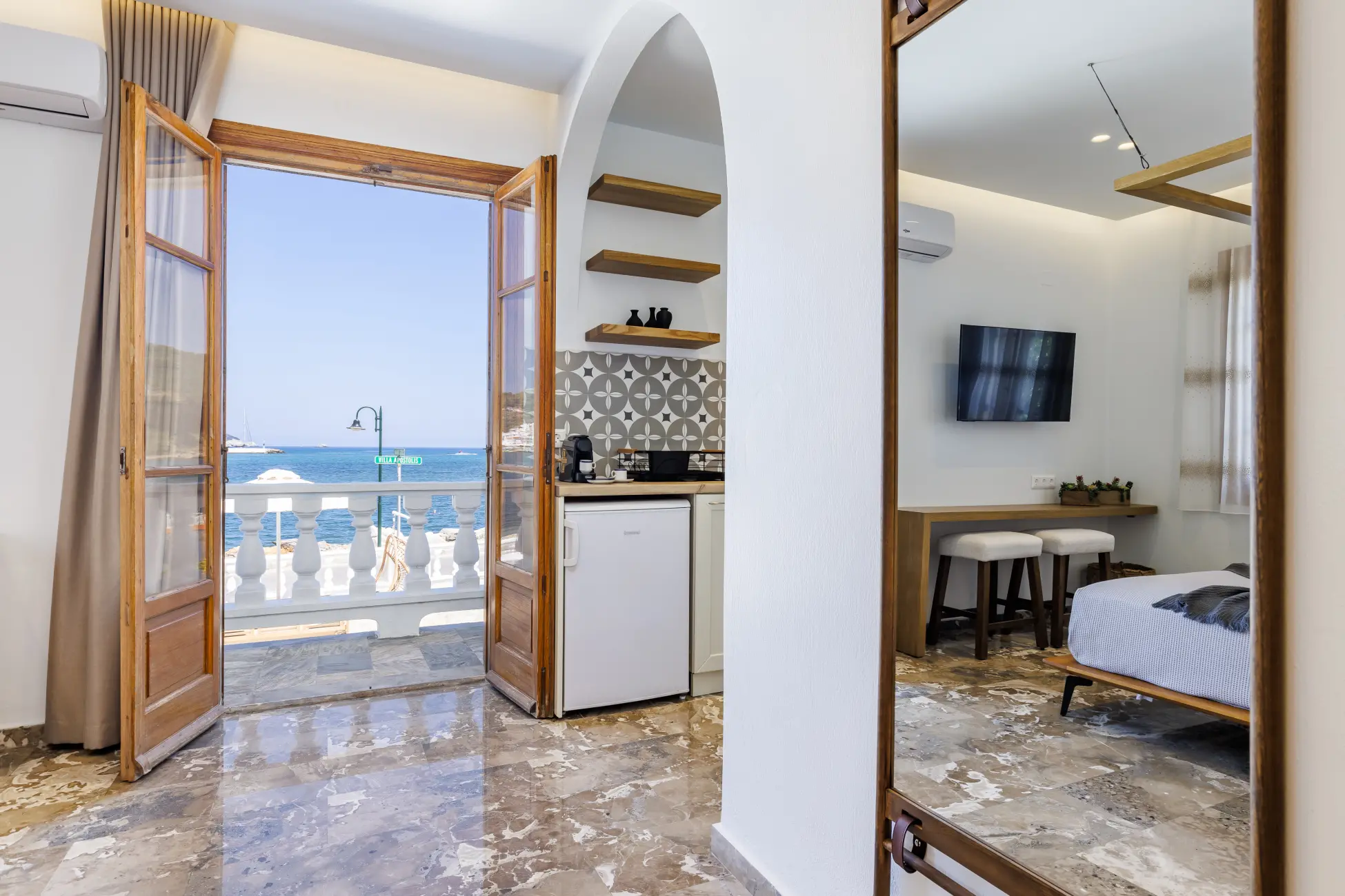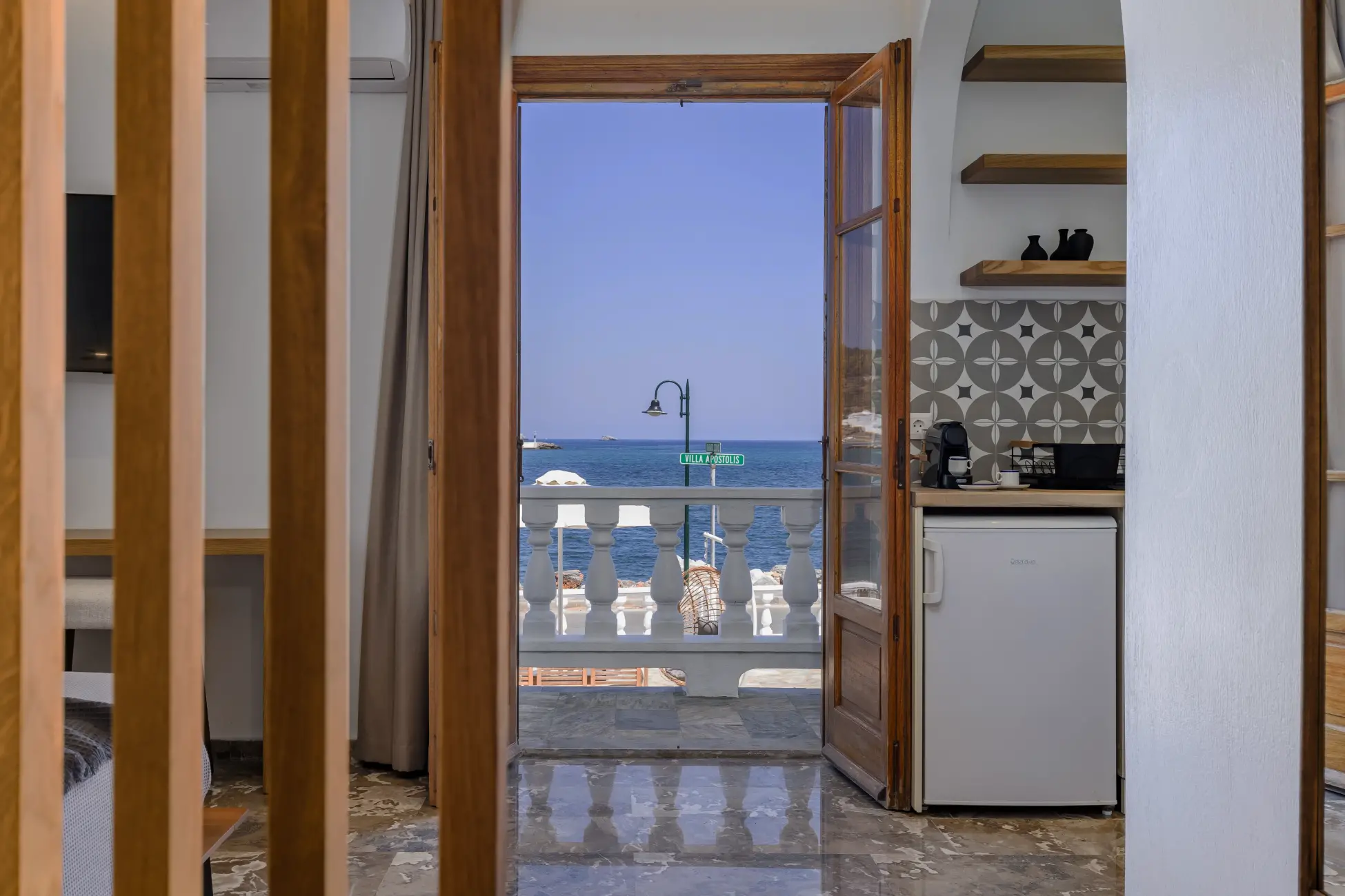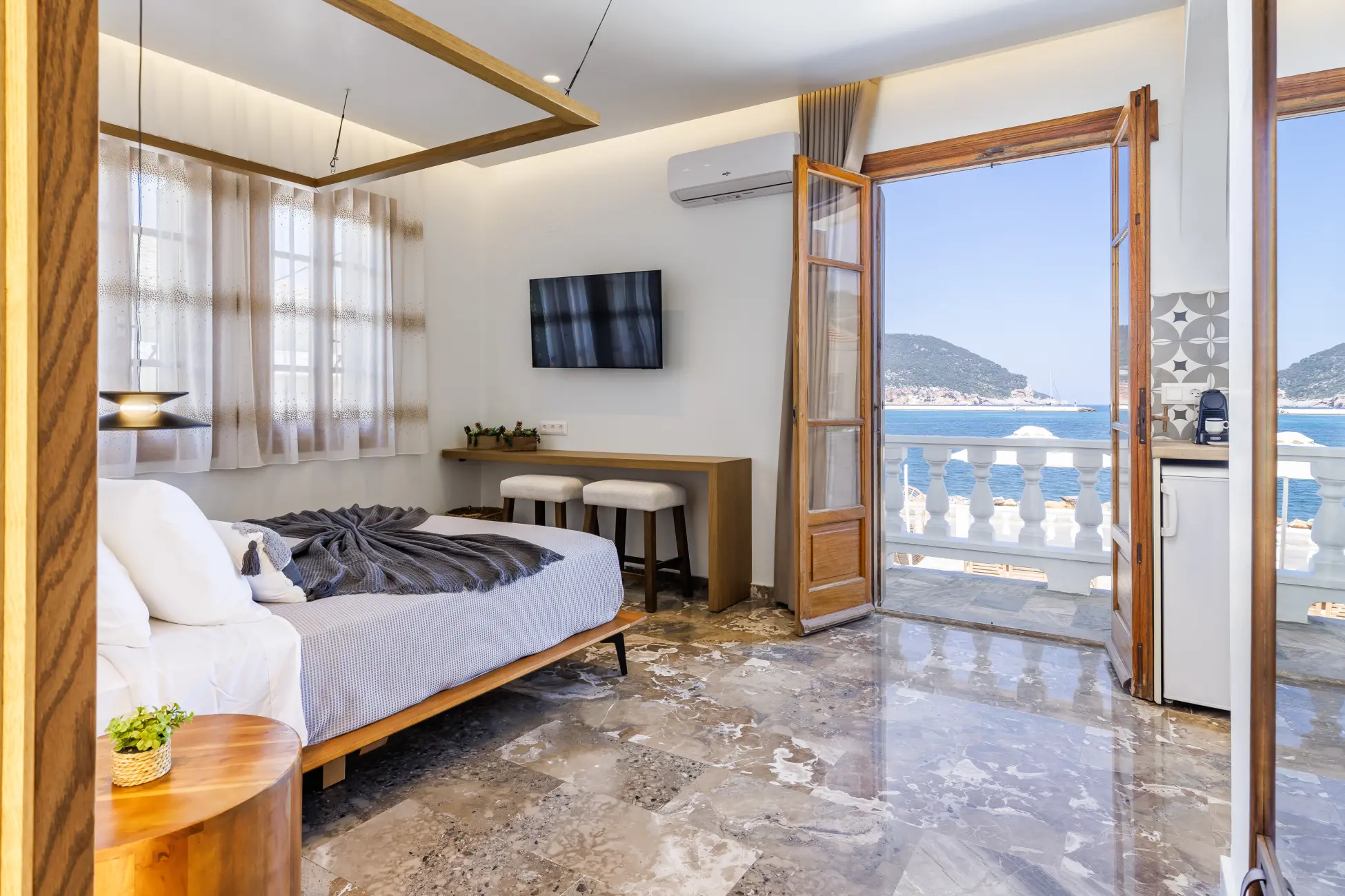 Our Deluxe studio encompass both breathtaking views of the sea, and a comfort like no other. As the sound of the waves gently lull you to sleep at night, you will not only feel refreshed, but also energized.