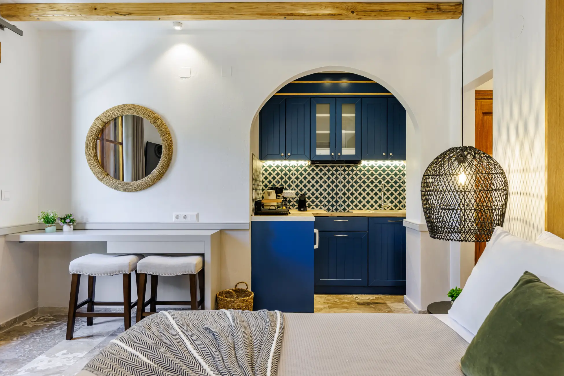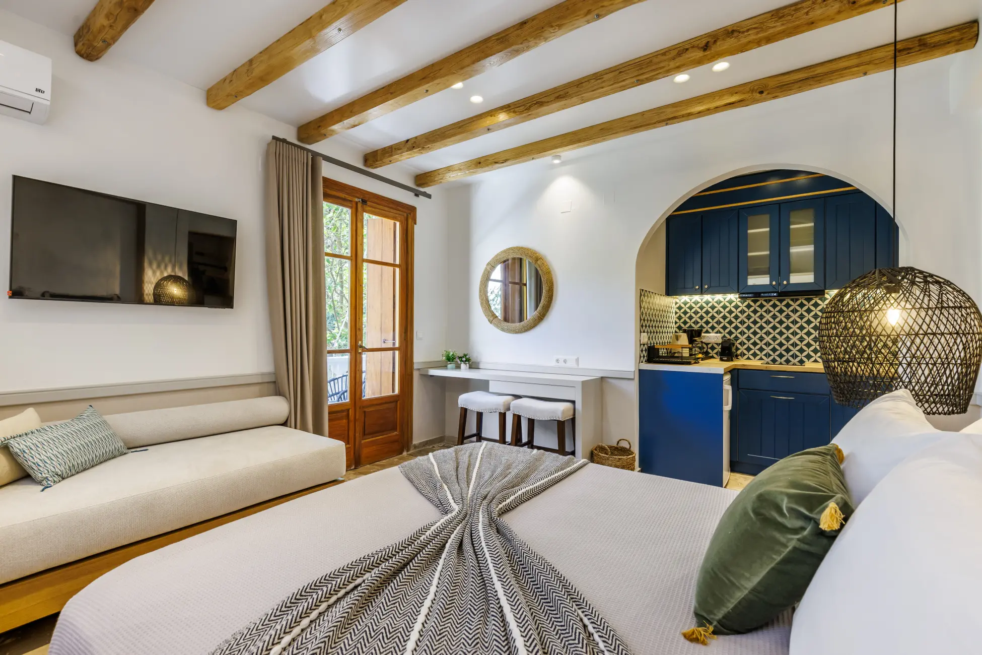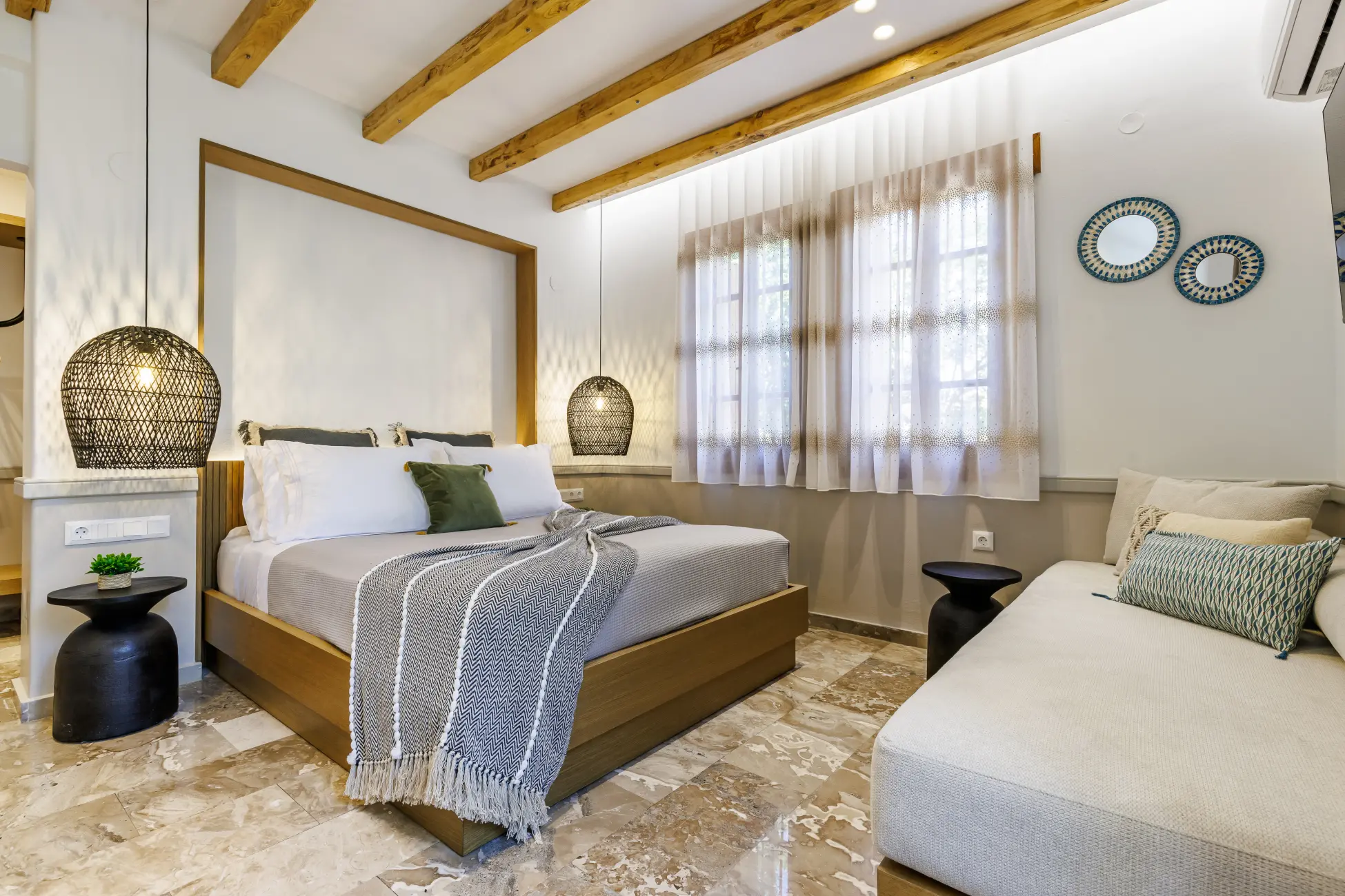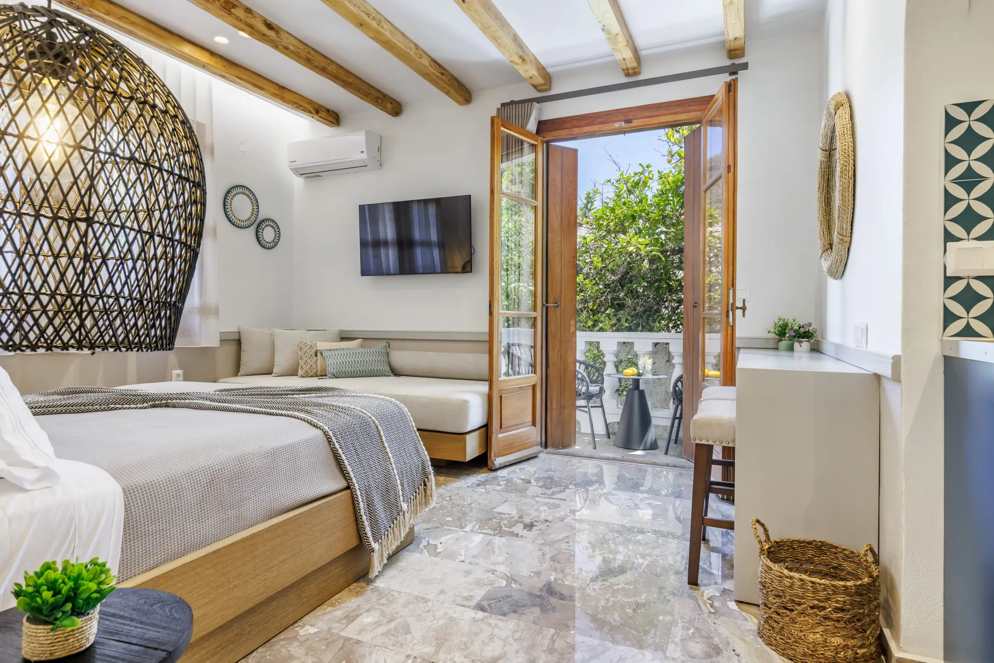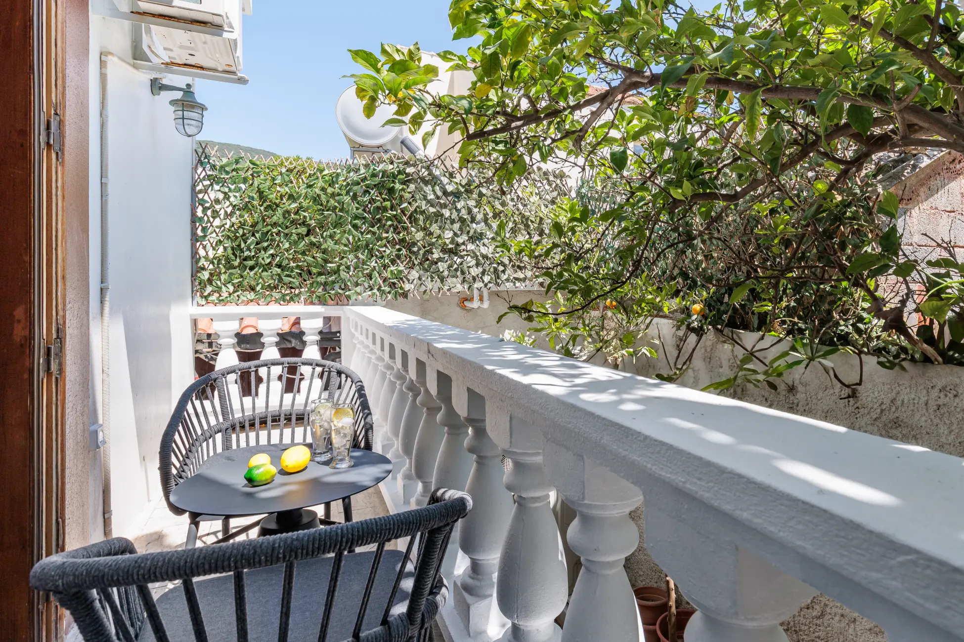 This larger studio is perfect for those who want a quiet escape. Peaceful during the day, for those afternoon naps, or just for those who want to sleep in. The soft breeze at night is so welcoming, and combined with the sound of the sea, it is a feeling like no other. This studio has a private view from the balcony.