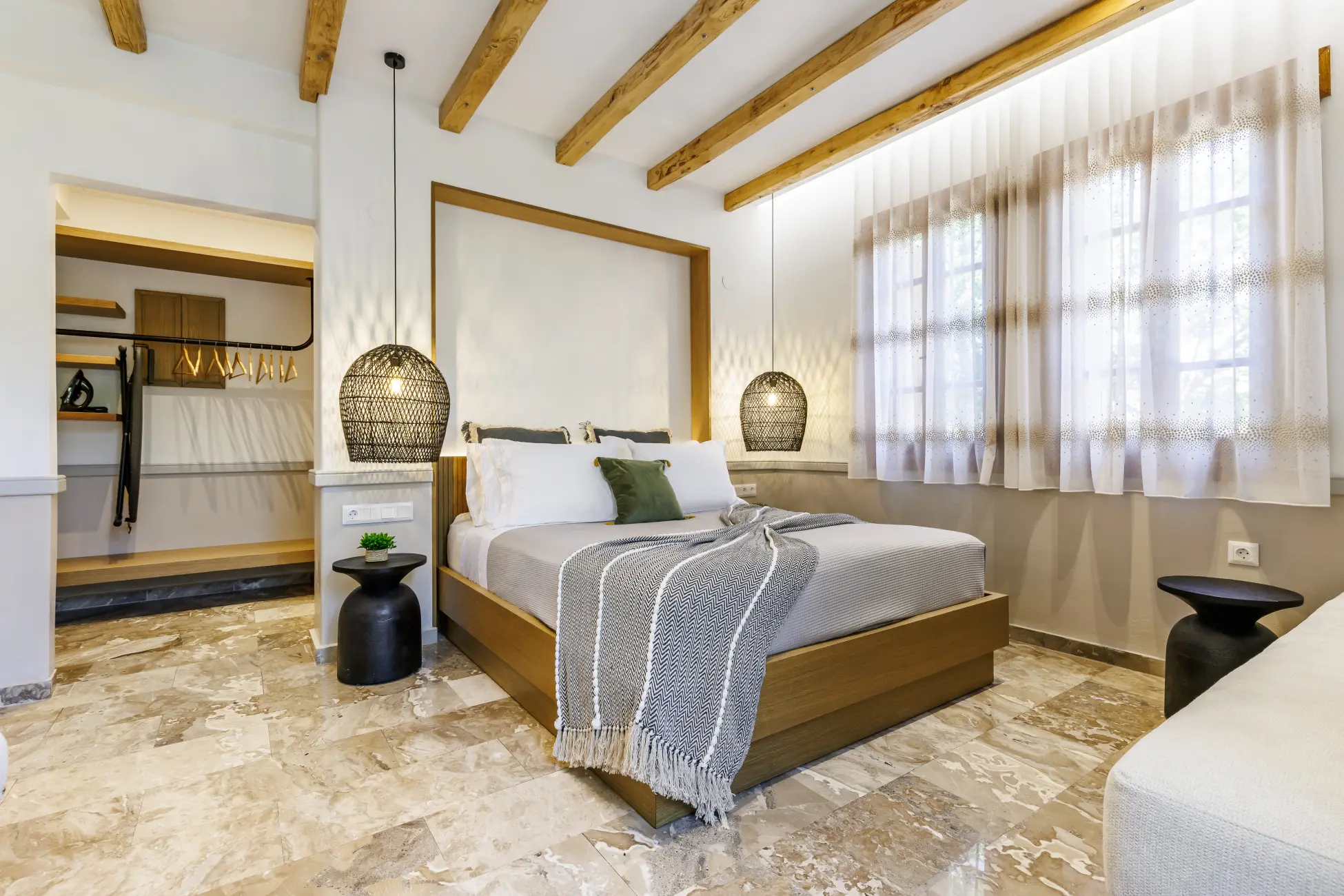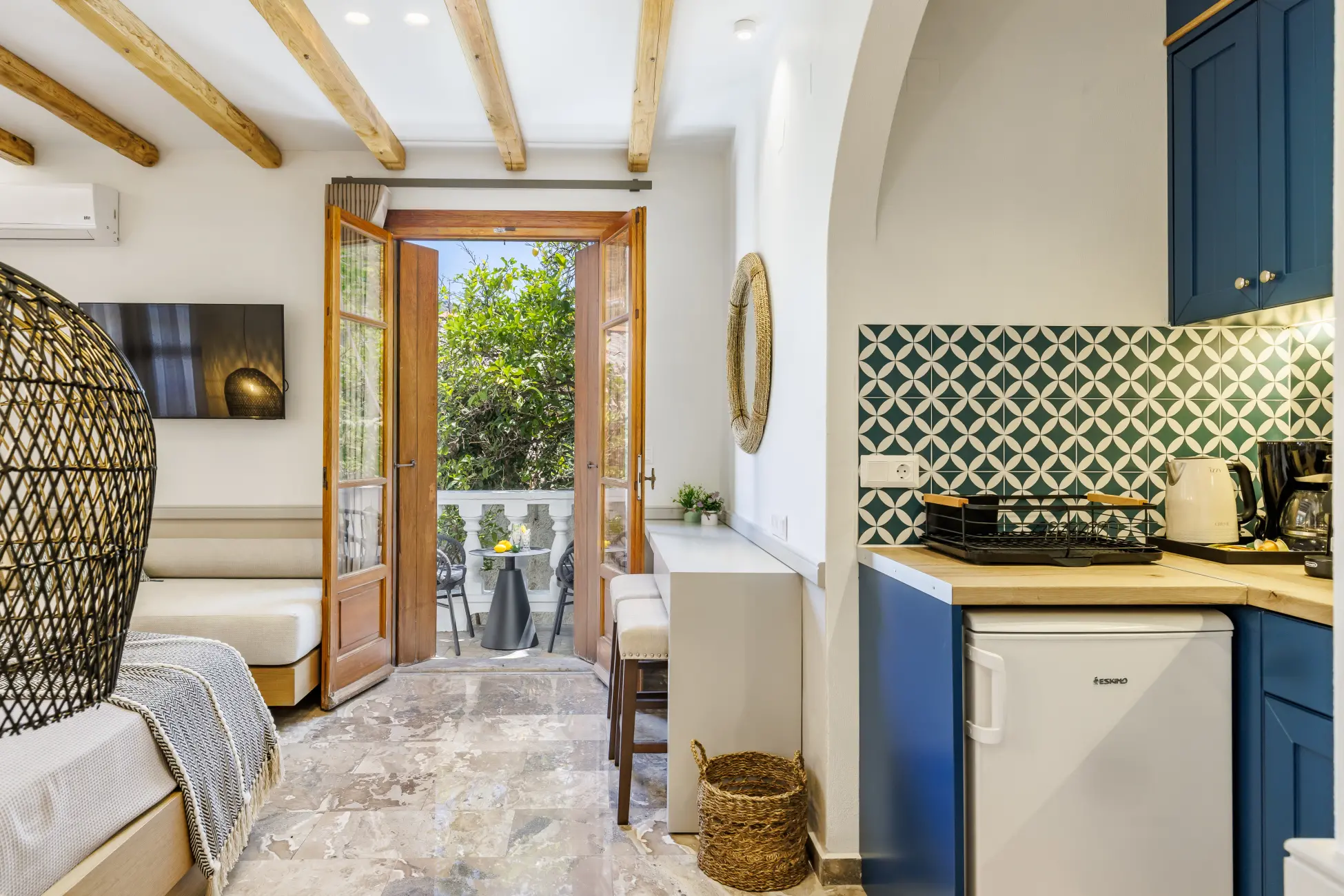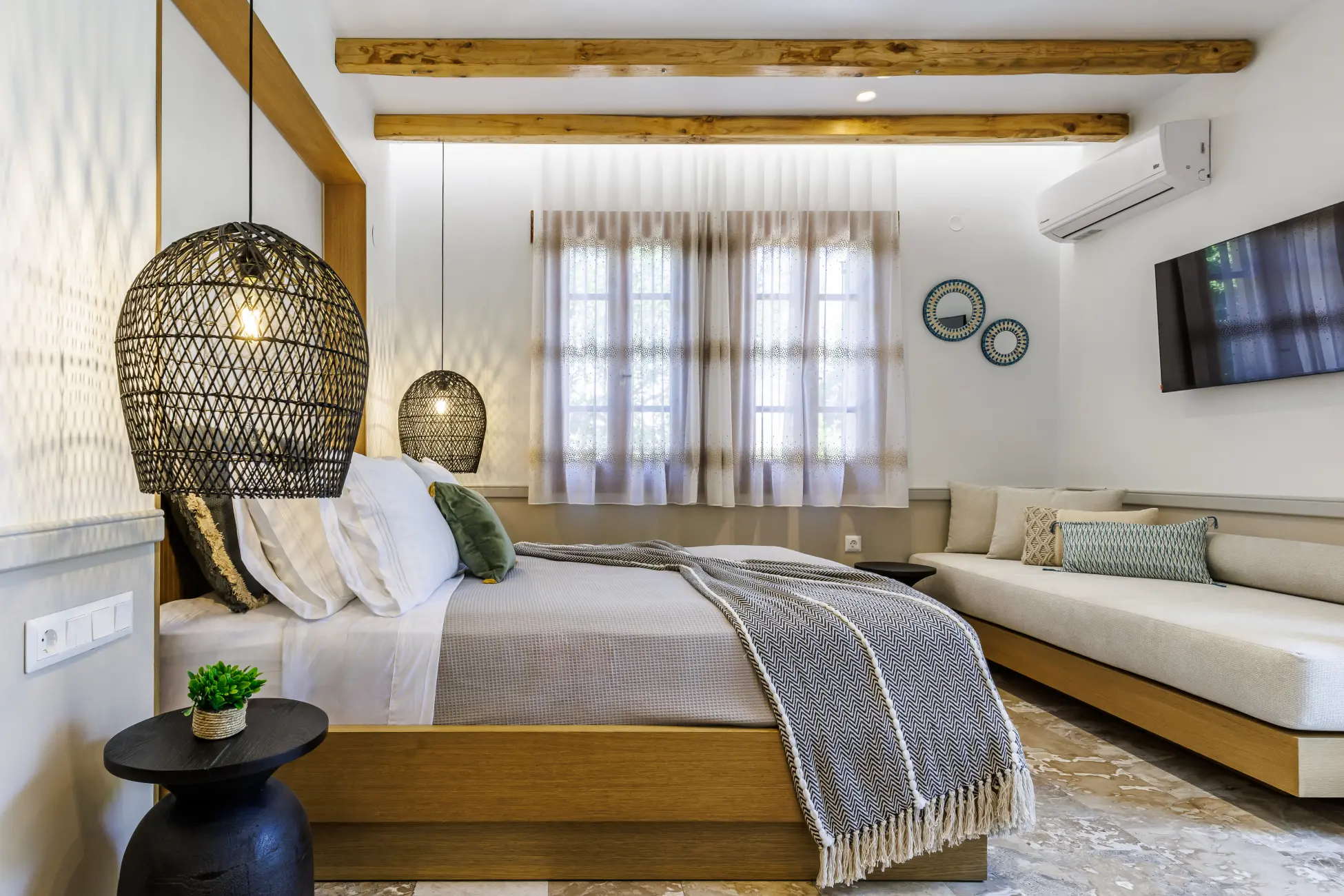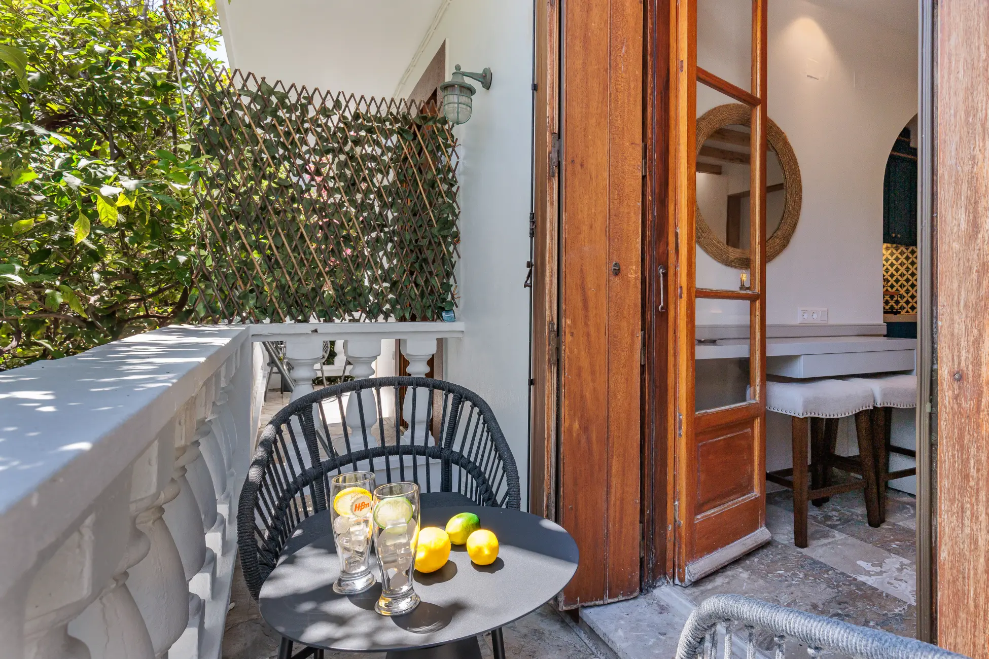 This larger studio is perfect for those who want a quiet escape. Peaceful during the day, for those afternoon naps, or just for those who want to sleep in. The soft breeze at night is so welcoming, and combined with the sound of the sea, it is a feeling like no other. This studio has a private view from the balcony.