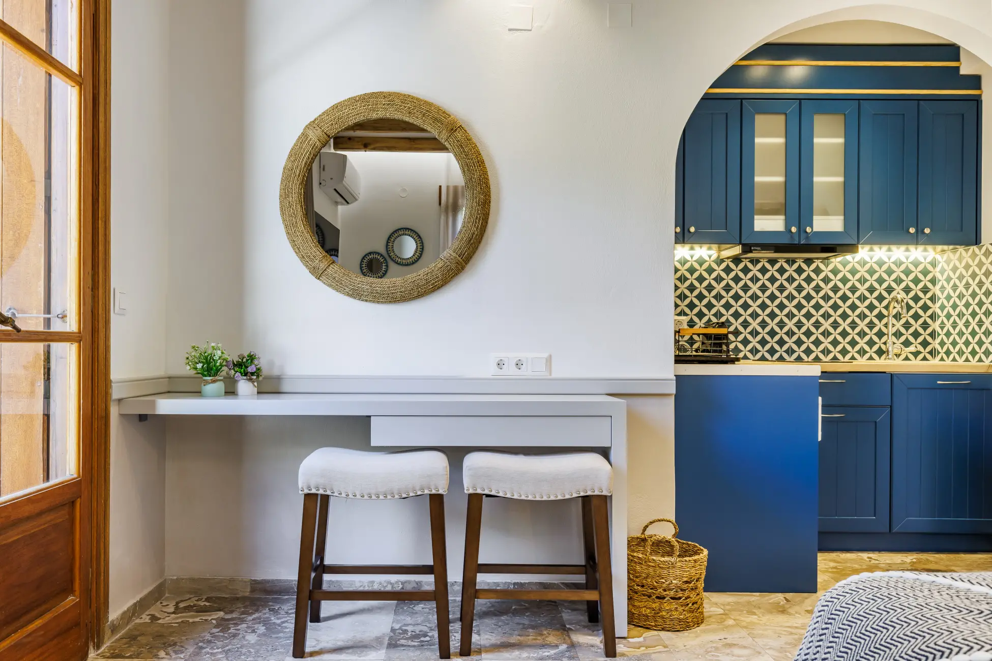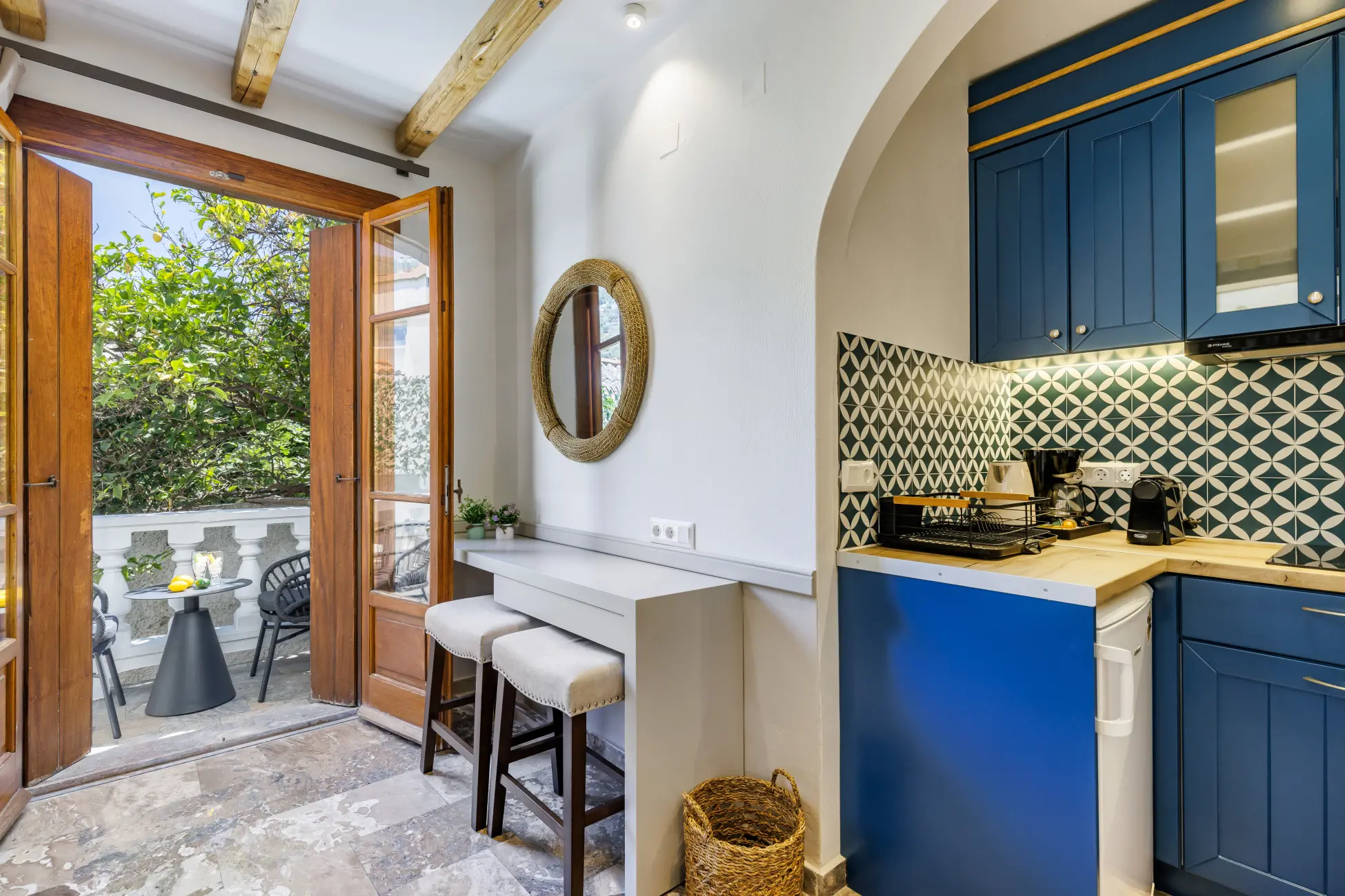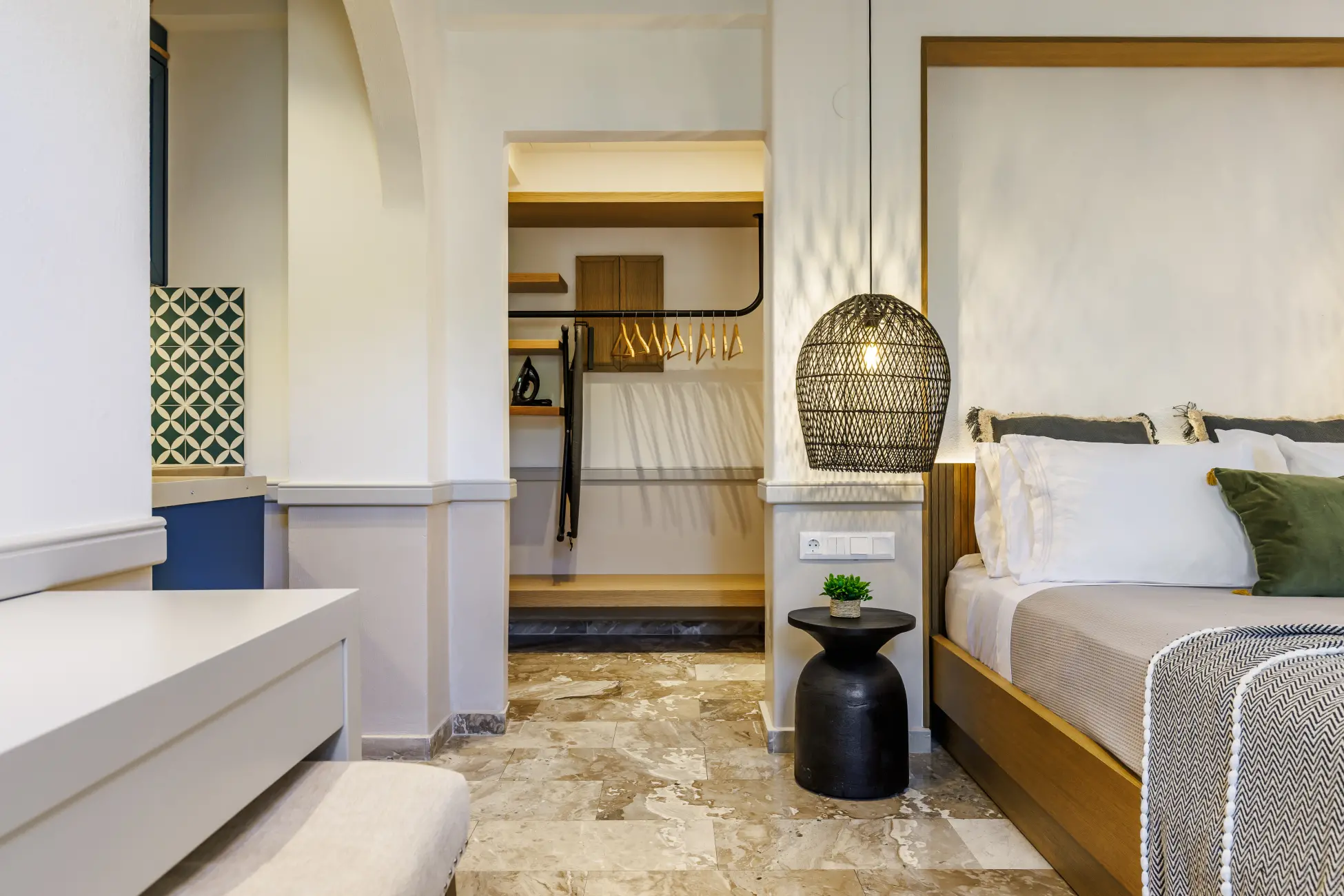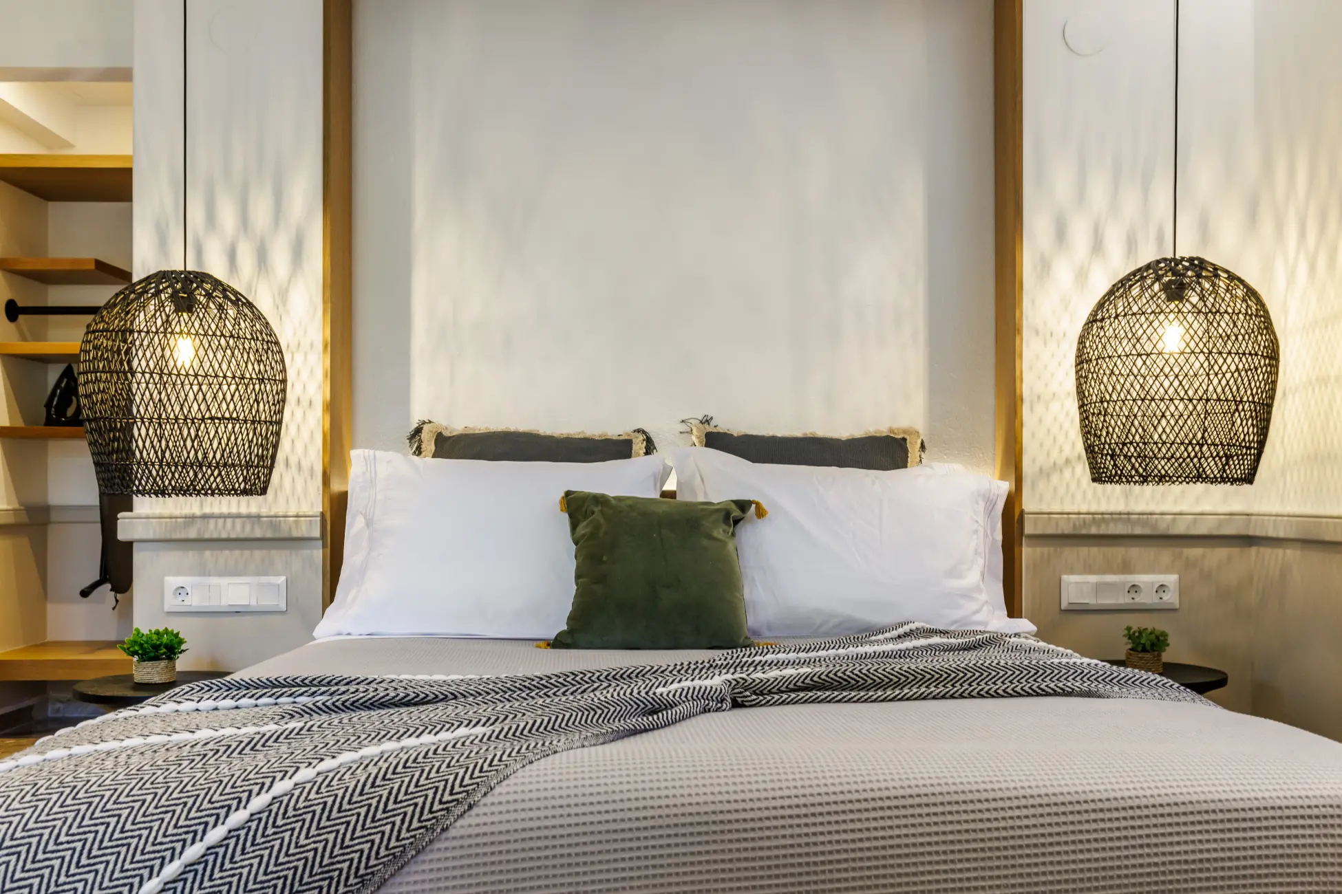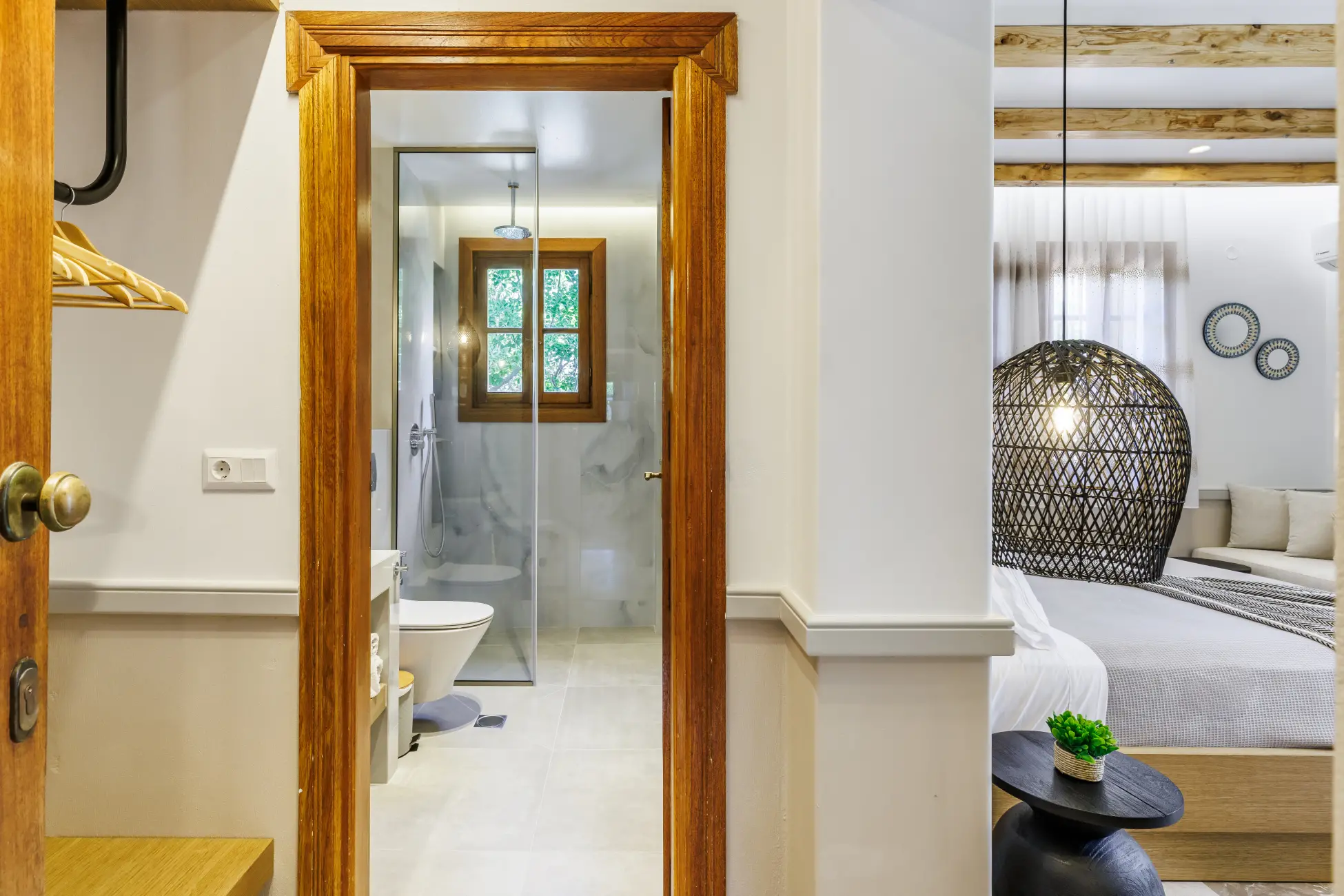 This larger studio is perfect for those who want a quiet escape. Peaceful during the day, for those afternoon naps, or just for those who want to sleep in. The soft breeze at night is so welcoming, and combined with the sound of the sea, it is a feeling like no other. This studio has a private view from the balcony.
